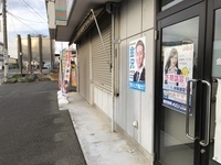建物の前、のぼりの立っているあたりが建物テナント共用の駐車スペースです。 -