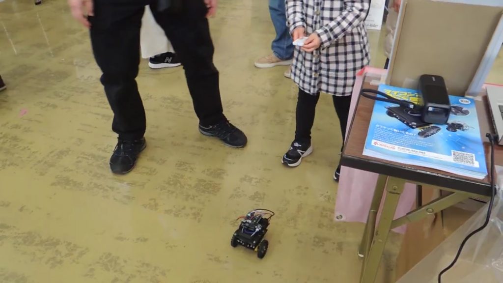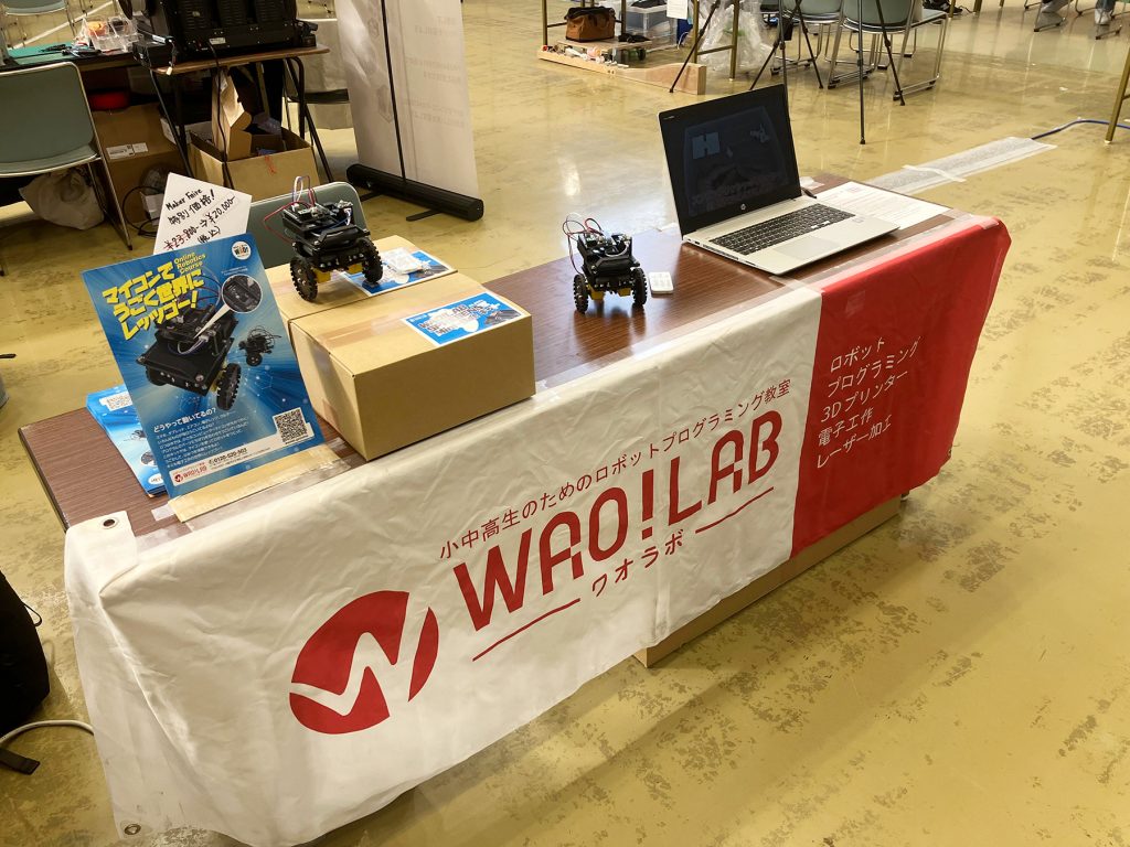 今回は、ワオラボのオンライン講座の商品として販売している、ソニーのマイコン「SPRESENSETM(スプレッセンス)※」を使った「WAO!LAB SPRESENSE Mini-Botキット」の展示を行いました。